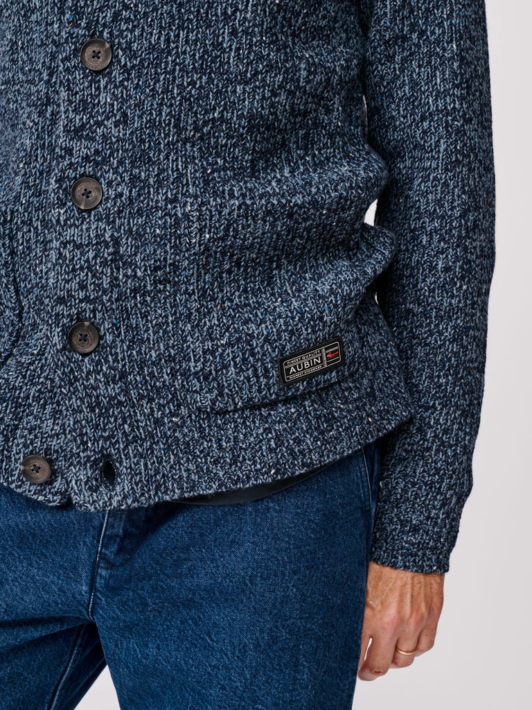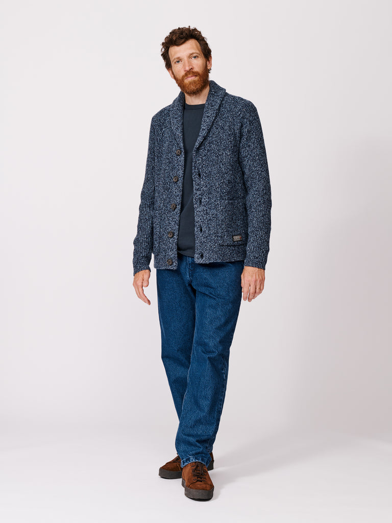Whether you are channelling your inner Starsky or hankering for crisp winter days the shawl neck cardigan is the perfect all-year-round alternative to a jacket. Some believe that the shawl neck cardigan originated from the smoking jacket of old, and the cardigan was originally designed for the 7th Earl of Cardigan, who requested a sweater that wouldn't mess up his hair! The Frampton is knitted in a fisherman's rib in a soft Donegal flecked yarn.