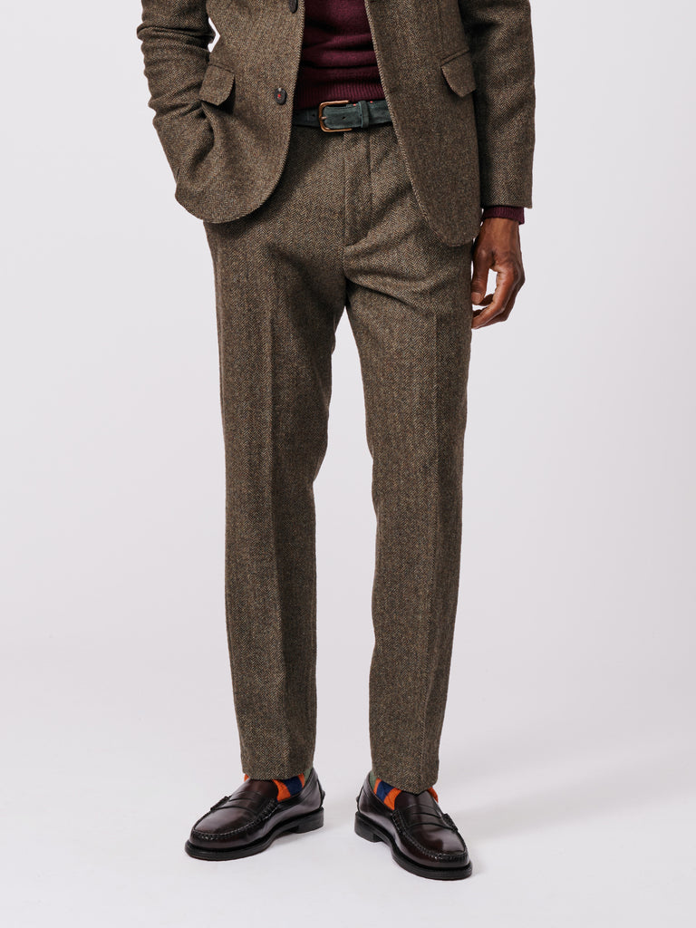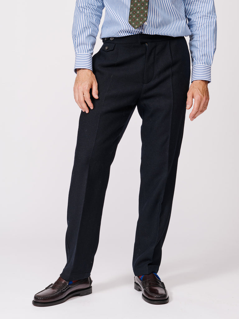 Our trousers work hard with and without their matching jackets. The Mareham trouser has a single pleat front with side pockets and waistband adjusters, the leg is roomier around the seat and fork then the Pasmore trousers. The leg shape is straight and tapers slightly at the hem. The Pasmore is a flat front trouser with a straight leg.