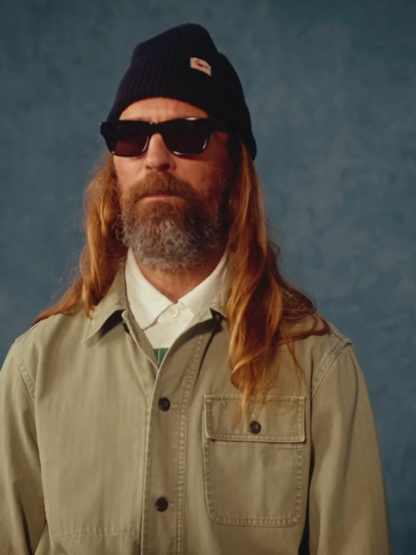- Available in washed blue broken twill cotton and a khaki herringbone weave cotton.